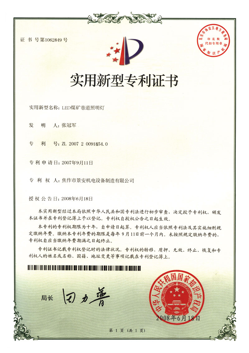 LED煤礦巷道照明燈專利證書(shū)1